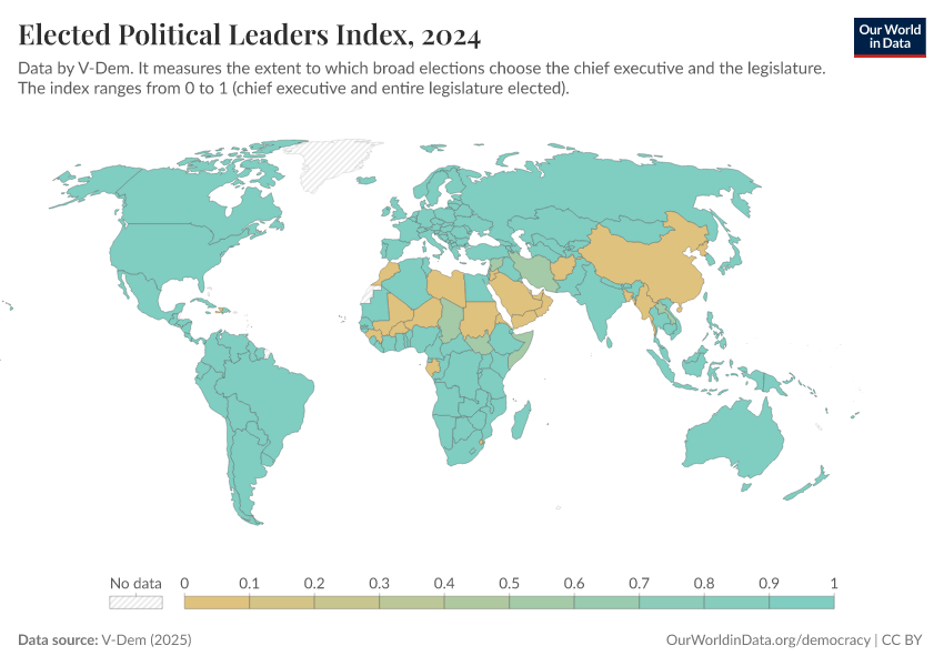 “Data Page: Elected officials index”, part of the following publication: Bastian Herre, Lucas Rodés-Guirao, and Esteban Ortiz-Ospina (2013) - “Democracy”. Data adapted from V-Dem. Retrieved from https://refactor-responseset-ergonom.owid.pages.dev:8789/20260119-070102/grapher/elected-political-leaders-index.html [online resource] (archived on January 19, 2026).How to cite this data