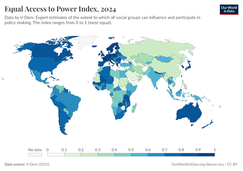 “Data Page: Equal access to power index”, part of the following publication: Bastian Herre, Lucas Rodés-Guirao, and Esteban Ortiz-Ospina (2013) - “Democracy”. Data adapted from V-Dem. Retrieved from https://refactor-responseset-ergonom.owid.pages.dev:8789/20260119-070102/grapher/equal-access-to-power-index.html [online resource] (archived on January 19, 2026).How to cite this data