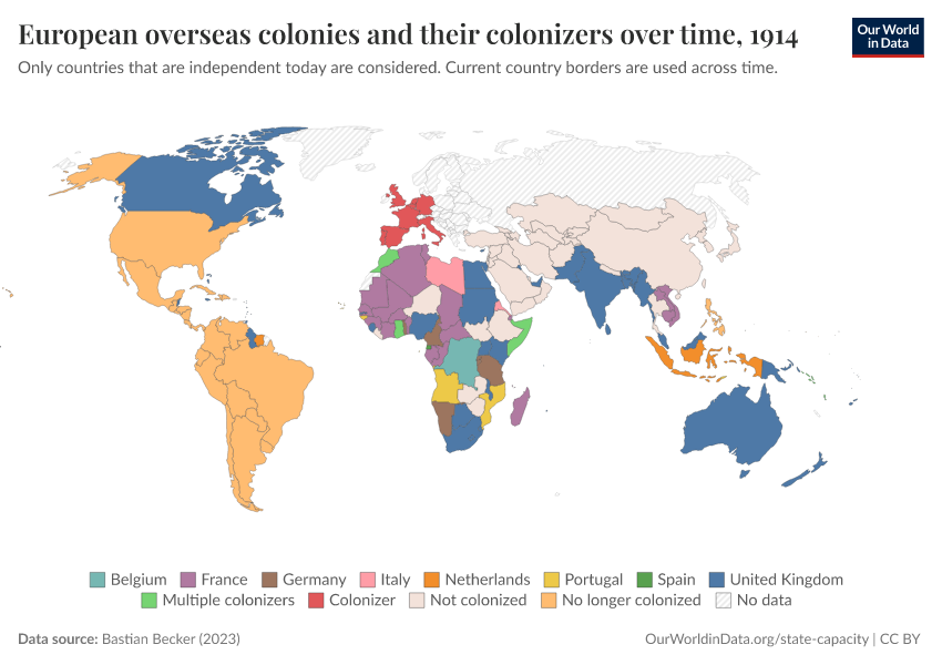 “Data Page: European overseas colonies and their colonizers over time”, part of the following publication: Bastian Herre and Pablo Arriagada (2023) - “State Capacity”. Data adapted from Bastian Becker. Retrieved from https://refactor-responseset-ergonom.owid.pages.dev:8789/20250909-093708/grapher/european-overseas-colonies-and-their-colonizers.html [online resource] (archived on September 9, 2025).How to cite this data