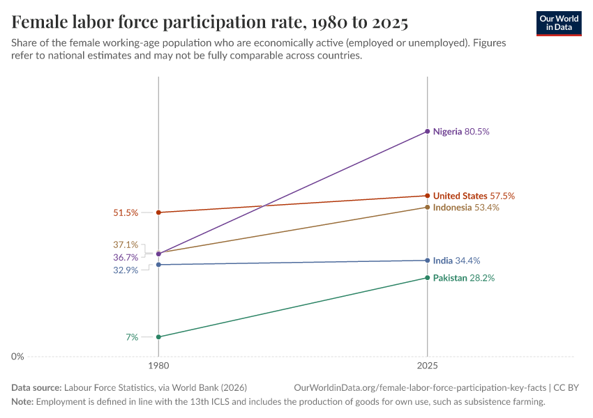 “Data Page: Female labor force participation rate”. Our World in Data (2026). Data adapted from Labour Force Statistics, via World Bank. Retrieved from https://refactor-responseset-ergonom.owid.pages.dev:8789/20260218-113149/grapher/female-labor-force-participation-rates-slopes.html [online resource] (archived on February 18, 2026).