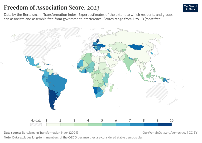 “Data Page: Freedom of Association Score”, part of the following publication: Bastian Herre, Lucas Rodés-Guirao, and Esteban Ortiz-Ospina (2013) - “Democracy”. Data adapted from Bertelsmann Transformation Index. Retrieved from https://refactor-responseset-ergonom.owid.pages.dev:8789/20260204-165456/grapher/freedom-of-association-score-bti.html [online resource] (archived on February 4, 2026).How to cite this data