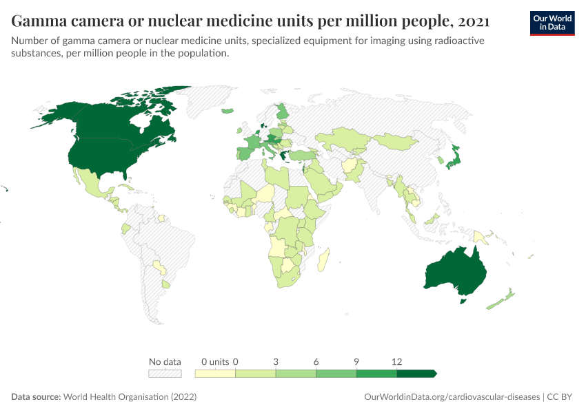 “Data Page: Gamma camera or nuclear medicine units per million people”, part of the following publication: Saloni Dattani, Veronika Samborska, Hannah Ritchie, and Max Roser (2023) - “Cardiovascular Diseases”. Data adapted from World Health Organisation. Retrieved from https://refactor-responseset-ergonom.owid.pages.dev:8789/20250909-093708/grapher/gamma-camera-or-nuclear-medicine-availability.html [online resource] (archived on September 9, 2025).How to cite this data