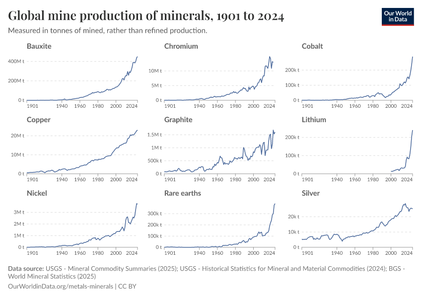 USGS - Mineral Commodity Summaries (2025); USGS - Historical Statistics for Mineral and Material Commodities (2024); BGS - World Mineral Statistics (2025) – with major processing by Our World in Data. “Global mine production of minerals” [dataset]. United States Geological Survey, “Mineral Commodity Summaries”; United States Geological Survey, “Historical Statistics for Mineral and Material Commodities”; British Geological Survey, “World Mineral Statistics” [original data]. Retrieved February 26, 2026 from https://refactor-responseset-ergonom.owid.pages.dev:8789/20260116-170644/grapher/global-mine-production-minerals.html (archived on January 16, 2026).