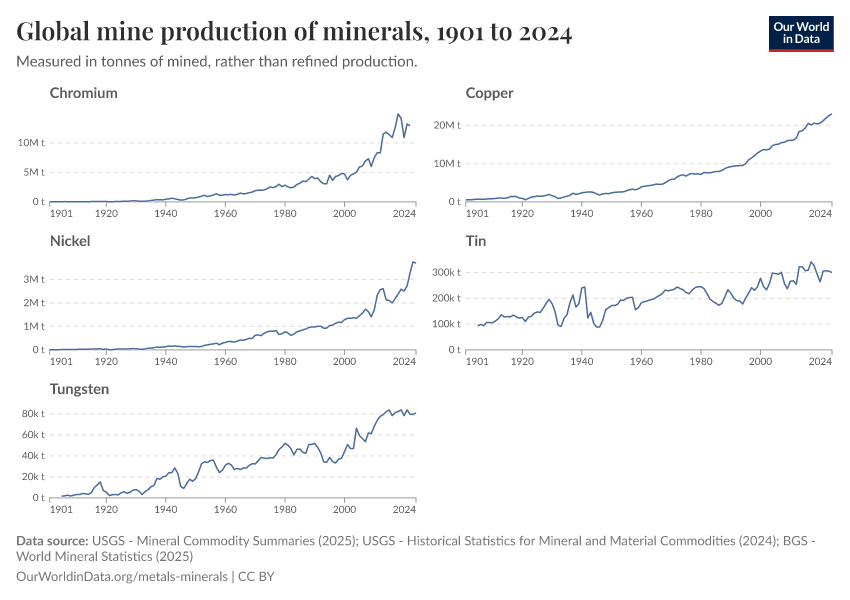 “Data Page: Global mine production of minerals”. Our World in Data (2026). Data adapted from United States Geological Survey, British Geological Survey. Retrieved from https://refactor-responseset-ergonom.owid.pages.dev:8789/20260116-170644/grapher/global-mine-production-minerals.html [online resource] (archived on January 16, 2026).How to cite this data