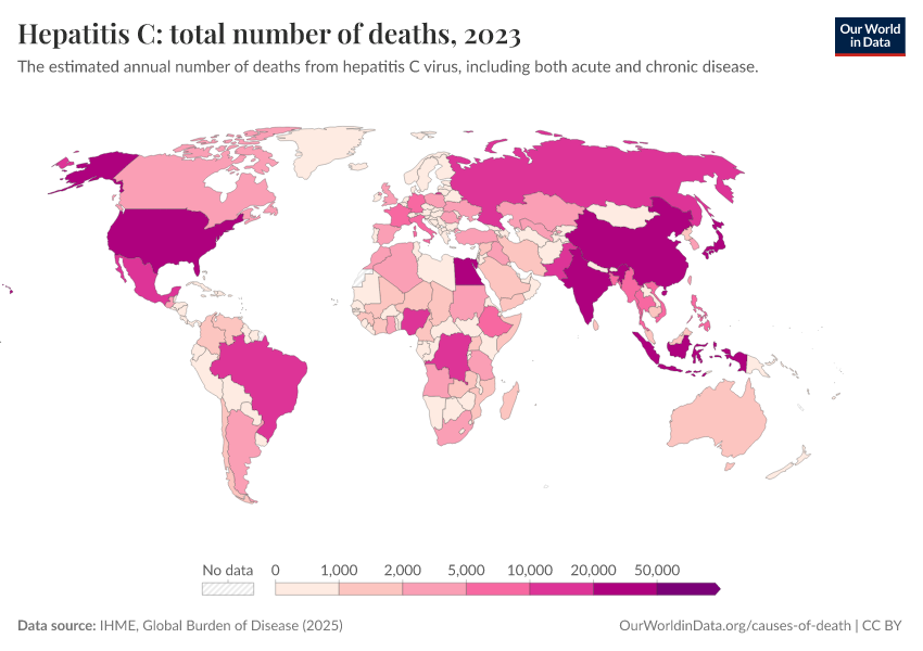“Data Page: Hepatitis C: total number of deaths”, part of the following publication: Esteban Ortiz-Ospina and Max Roser (2016) - “Global Health”. Data adapted from IHME, Global Burden of Disease. Retrieved from https://refactor-responseset-ergonom.owid.pages.dev:8789/20260211-174736/grapher/hepatitis-c-number-of-deaths.html [online resource] (archived on February 11, 2026).How to cite this data