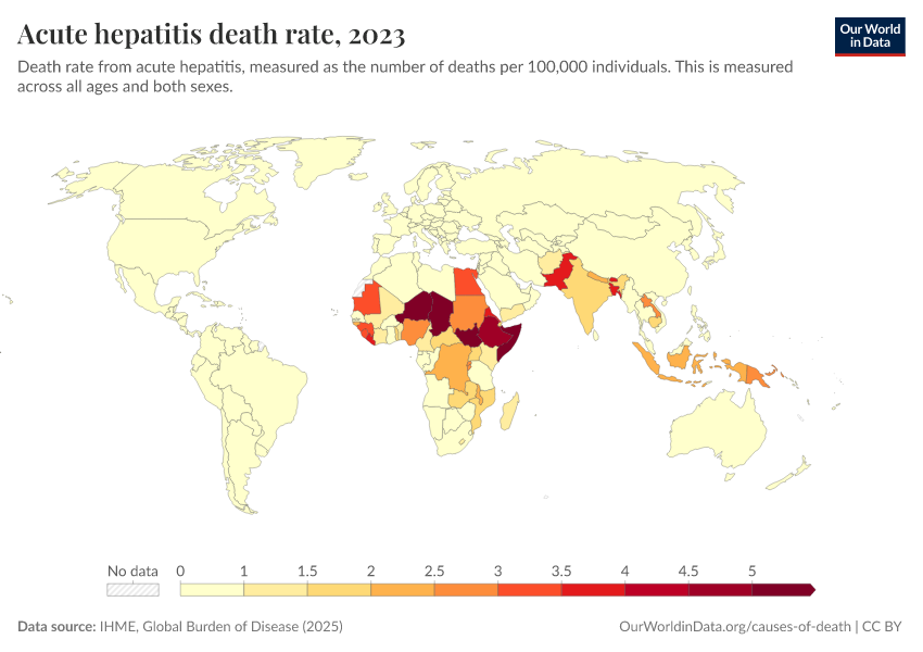 “Data Page: Acute hepatitis death rate”, part of the following publication: Esteban Ortiz-Ospina and Max Roser (2016) - “Global Health”. Data adapted from IHME, Global Burden of Disease. Retrieved from https://refactor-responseset-ergonom.owid.pages.dev:8789/20260211-174736/grapher/hepatitis-death-rate.html [online resource] (archived on February 11, 2026).How to cite this data