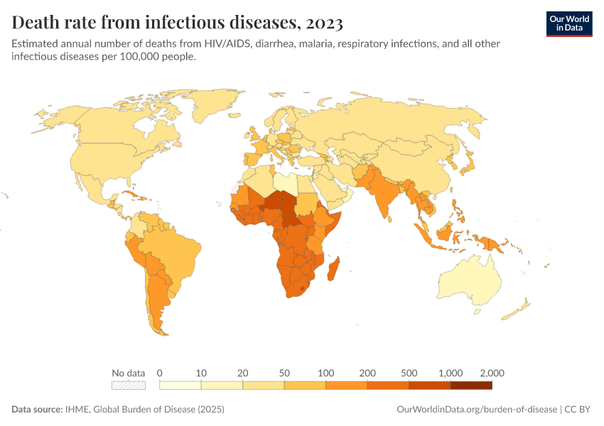 IHME, Global Burden of Disease (2025) – with major processing by Our World in Data. “Death rate from infectious diseases” [dataset]. IHME, Global Burden of Disease, “Global Burden of Disease - Deaths” [original data]. Retrieved February 26, 2026 from https://refactor-responseset-ergonom.owid.pages.dev:8789/20260211-174736/grapher/infectious-disease-death-rates-gbd.html (archived on February 11, 2026).