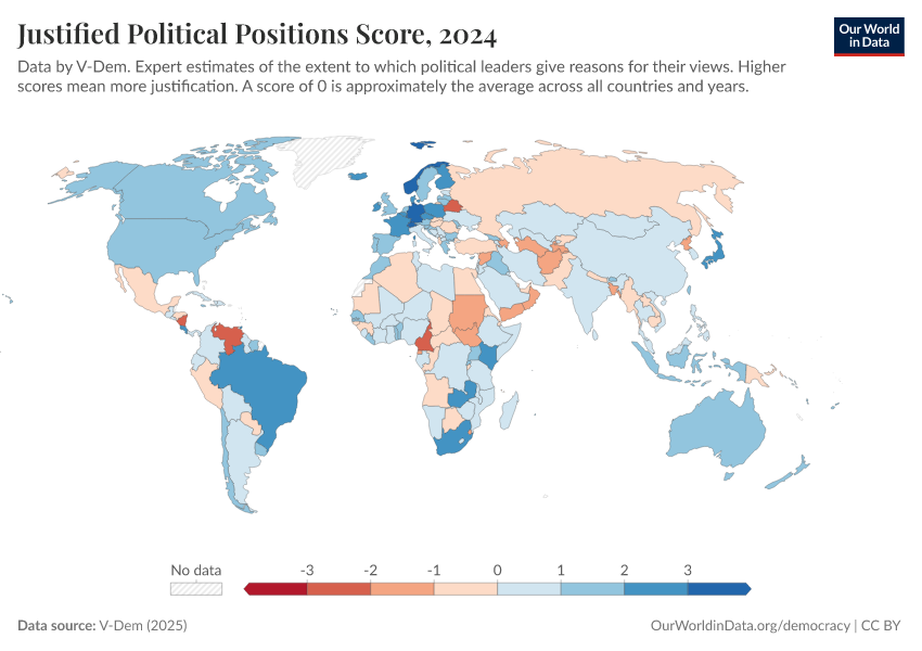 “Data Page: Justified political positions”, part of the following publication: Bastian Herre, Lucas Rodés-Guirao, and Esteban Ortiz-Ospina (2013) - “Democracy”. Data adapted from V-Dem. Retrieved from https://refactor-responseset-ergonom.owid.pages.dev:8789/20260204-170225/grapher/justified-political-positions-score.html [online resource] (archived on February 4, 2026).How to cite this data