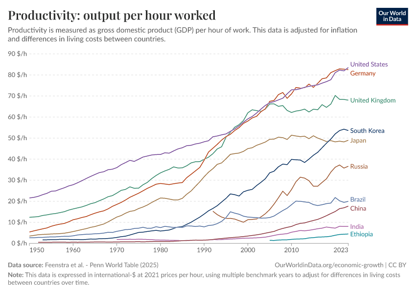 Feenstra et al. - Penn World Table (2025) – with major processing by Our World in Data. “Productivity: output per hour worked – Penn World Table – In constant international-$” [dataset]. Feenstra et al., “Penn World Table 11.0” [original data]. Retrieved February 26, 2026 from https://refactor-responseset-ergonom.owid.pages.dev:8789/20251013-111729/grapher/labor-productivity-per-hour-pennworldtable.html (archived on October 13, 2025).