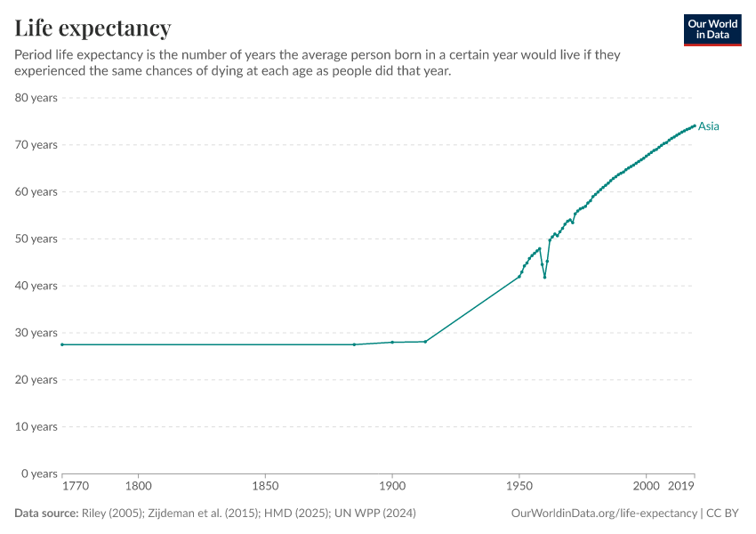 - This chart shows long-run estimates of life expectancy compiled by our team from several data sources. Before 1950, for country-level data, we rely on the Human Mortality Database (2025) combined with Zijdeman (2015). For regional data, we use Riley (2005). From 1950 onward, we use the United Nations World Population Prospects (2024).