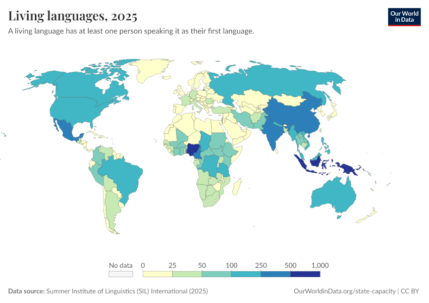 “Data Page: Living languages”, part of the following publication: Bastian Herre and Pablo Arriagada (2023) - “State Capacity”. Data adapted from Summer Institute of Linguistics (SIL) International. Retrieved from https://refactor-responseset-ergonom.owid.pages.dev:8789/20251023-195030/grapher/living-languages.html [online resource] (archived on October 23, 2025).How to cite this data