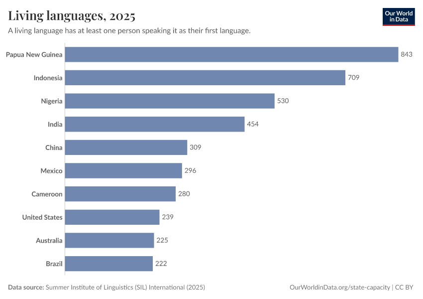 “Data Page: Living languages”, part of the following publication: Bastian Herre and Pablo Arriagada (2023) - “State Capacity”. Data adapted from Summer Institute of Linguistics (SIL) International. Retrieved from https://refactor-responseset-ergonom.owid.pages.dev:8789/20251023-195030/grapher/living-languages.html [online resource] (archived on October 23, 2025).How to cite this data