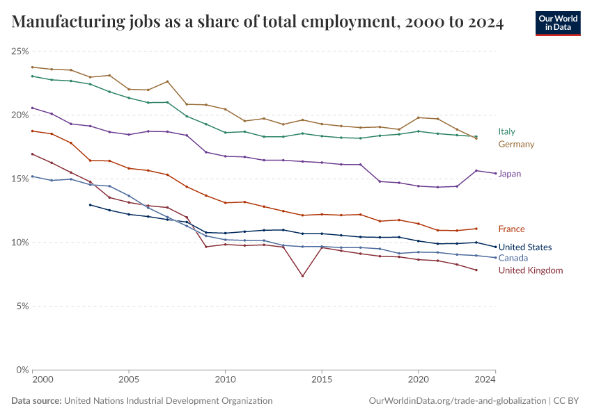 “Data Page: Manufacturing jobs as a share of total employment”. Our World in Data (2026). Data adapted from United Nations Industrial Development Organization. Retrieved from https://refactor-responseset-ergonom.owid.pages.dev:8789/20260130-180113/grapher/manufacturing-share-of-total-employment.html [online resource] (archived on January 30, 2026).How to cite this data