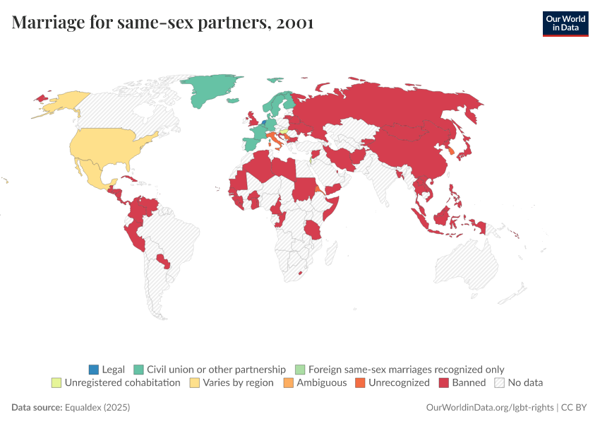 “Data Page: Marriage for same-sex partners”, part of the following publication: Bastian Herre and Pablo Arriagada (2023) - “LGBT+ Rights”. Data adapted from Equaldex. Retrieved from https://refactor-responseset-ergonom.owid.pages.dev:8789/20250909-093708/grapher/marriage-same-sex-partners-equaldex.html [online resource] (archived on September 9, 2025).How to cite this data