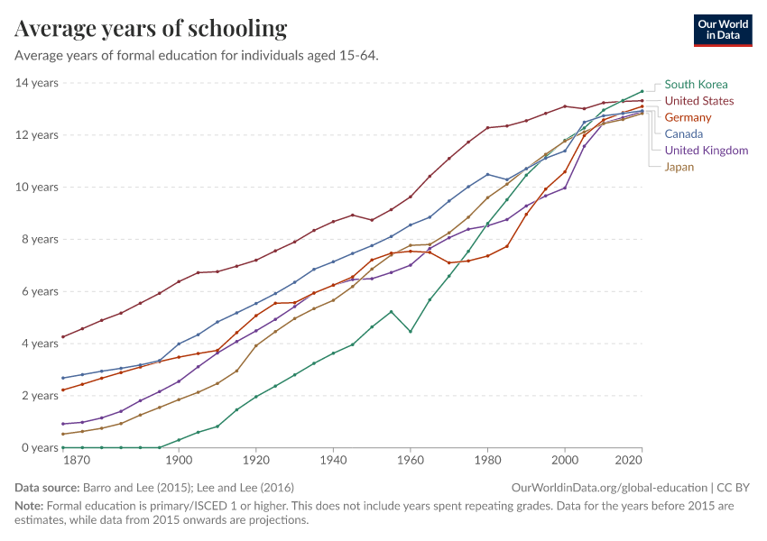 Barro and Lee (2015); Lee and Lee (2016) – with major processing by Our World in Data. “Average years of schooling” [dataset]. Barro and Lee, “Projections of Educational Attainment”; Lee and Lee, “Human Capital in the Long Run” [original data]. Retrieved February 26, 2026 from https://refactor-responseset-ergonom.owid.pages.dev:8789/20260119-070102/grapher/mean-years-of-schooling-long-run.html (archived on January 19, 2026).