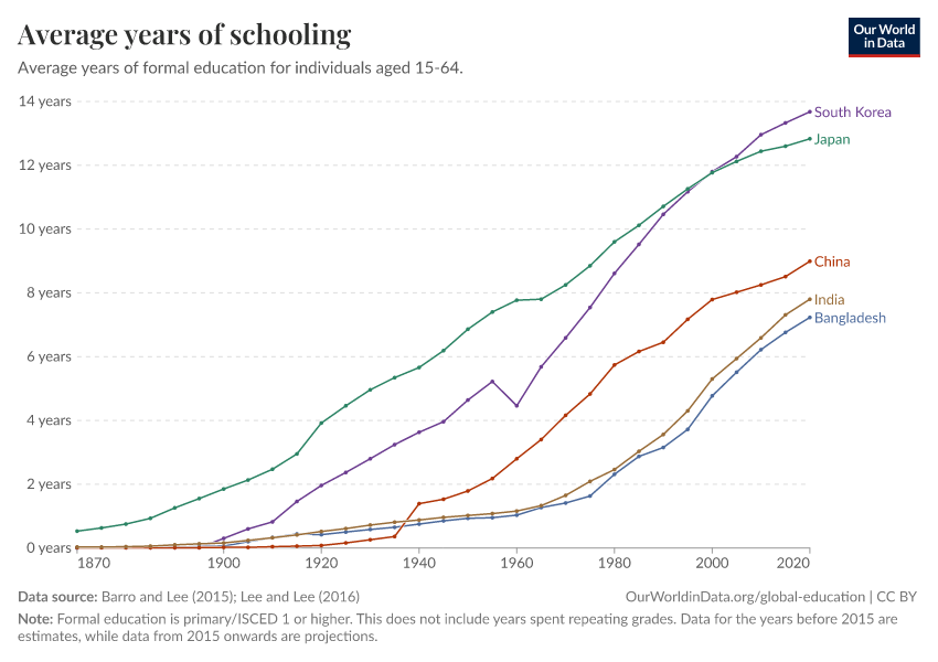 Barro and Lee (2015); Lee and Lee (2016) – with major processing by Our World in Data. “Average years of schooling” [dataset]. Barro and Lee, “Projections of Educational Attainment”; Lee and Lee, “Human Capital in the Long Run” [original data]. Retrieved February 26, 2026 from https://refactor-responseset-ergonom.owid.pages.dev:8789/20260119-070102/grapher/mean-years-of-schooling-long-run.html (archived on January 19, 2026).