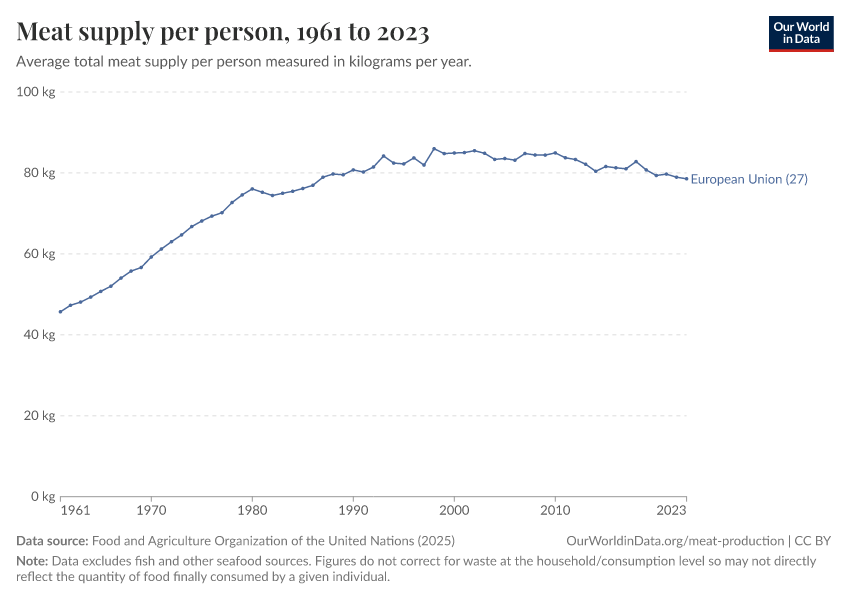 “Data Page: Yearly per capita supply of all meat”. Our World in Data (2026). Data adapted from Food and Agriculture Organization of the United Nations. Retrieved from https://refactor-responseset-ergonom.owid.pages.dev:8789/20260225-014904/grapher/meat-supply-per-person.html [online resource] (archived on February 25, 2026).