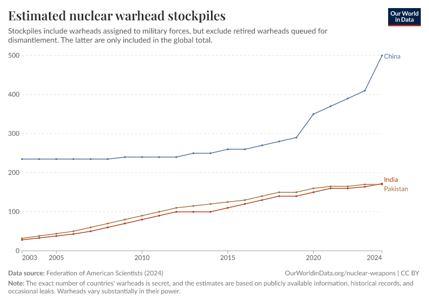 “Data Page: Estimated nuclear warhead stockpiles”, part of the following publication: Bastian Herre, Pablo Rosado, and Max Roser (2024) - “Nuclear Weapons”. Data adapted from Federation of American Scientists. Retrieved from https://refactor-responseset-ergonom.owid.pages.dev:8789/20250909-093708/grapher/nuclear-warhead-stockpiles-lines.html [online resource] (archived on September 9, 2025).How to cite this data