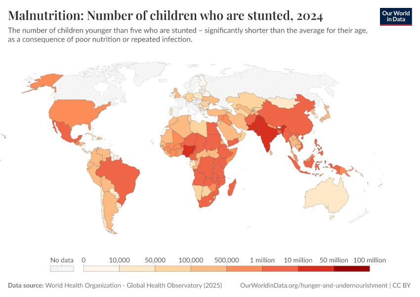 “Data Page: Malnutrition: Number of children who are stunted”. Our World in Data (2026). Data adapted from World Health Organization. Retrieved from https://refactor-responseset-ergonom.owid.pages.dev:8789/20260119-070102/grapher/number-children-stunted-who.html [online resource] (archived on January 19, 2026).How to cite this data