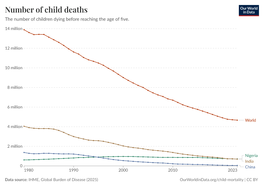 “Data Page: Number of child deaths”, part of the following publication: Esteban Ortiz-Ospina and Max Roser (2016) - “Global Health”. Data adapted from IHME, Global Burden of Disease. Retrieved from https://refactor-responseset-ergonom.owid.pages.dev:8789/20260211-174736/grapher/number-of-child-deaths.html [online resource] (archived on February 11, 2026).How to cite this data