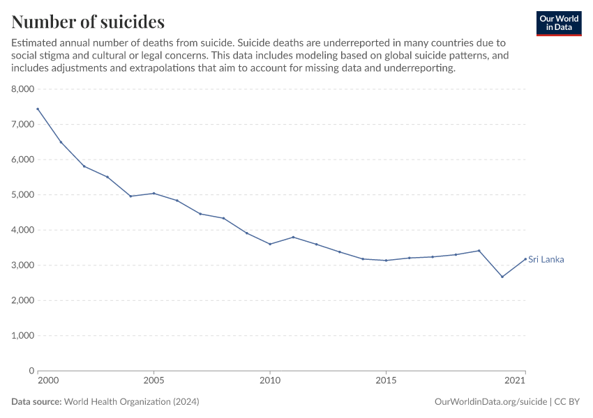 World Health Organization (2024) – with major processing by Our World in Data. “Number of suicides” [dataset]. World Health Organization, “Global Health Estimates” [original data]. Retrieved February 26, 2026 from https://refactor-responseset-ergonom.owid.pages.dev:8789/20250909-093708/grapher/number-of-deaths-from-suicide-ghe.html (archived on September 9, 2025).
