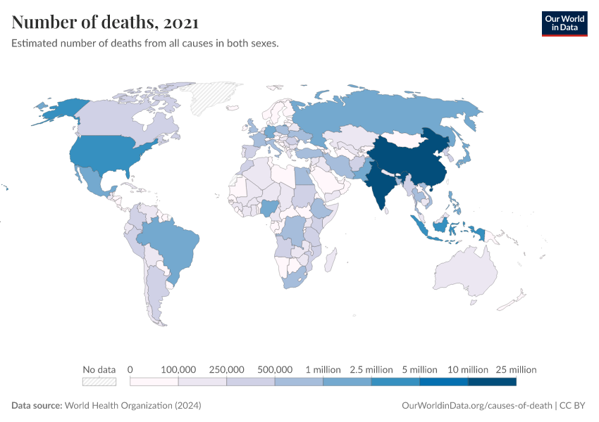 “Data Page: Number of deaths”, part of the following publication: Esteban Ortiz-Ospina and Max Roser (2016) - “Global Health”. Data adapted from World Health Organization. Retrieved from https://refactor-responseset-ergonom.owid.pages.dev:8789/20250909-093708/grapher/number-of-deaths-who.html [online resource] (archived on September 9, 2025).How to cite this data
