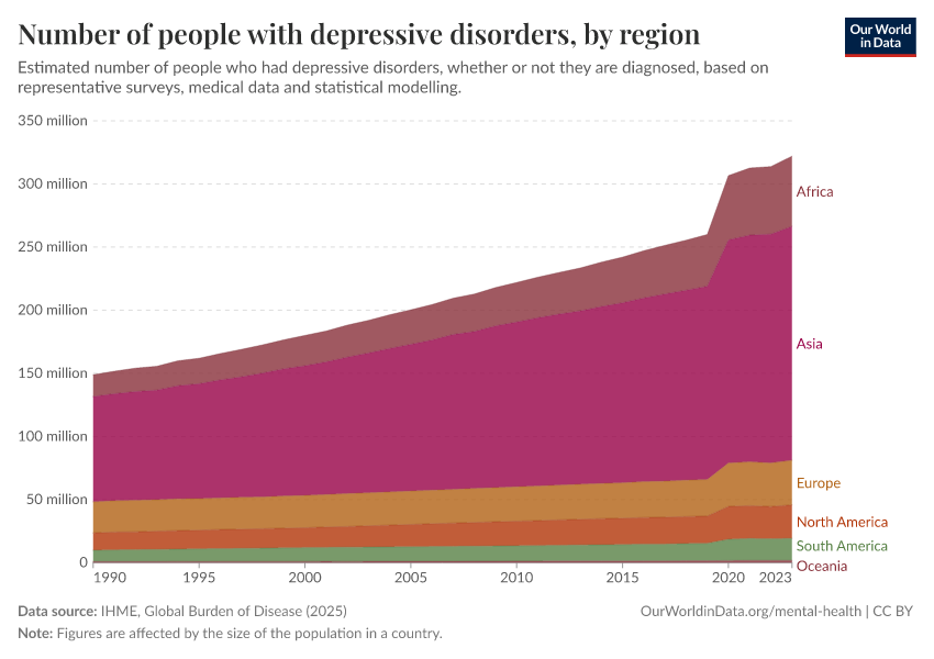 IHME, Global Burden of Disease (2025) – with major processing by Our World in Data. “Number of people with depressive disorders, by region” [dataset]. IHME, Global Burden of Disease, “Global Burden of Disease - Mental Health Prevalence” [original data]. Retrieved February 26, 2026 from https://refactor-responseset-ergonom.owid.pages.dev:8789/20260212-100858/grapher/number-suffering-from-depression-by-region.html (archived on February 12, 2026).