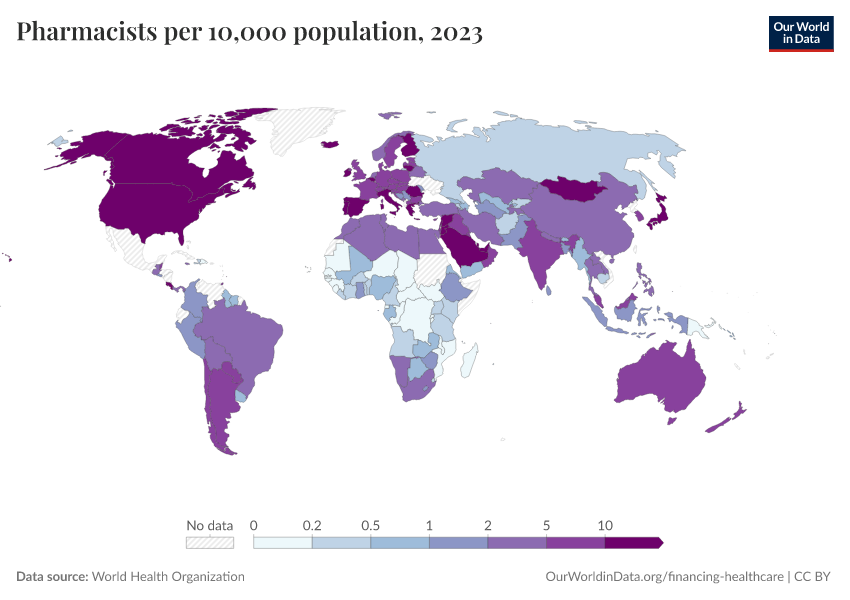 “Data Page: Pharmacists per 10,000 population”. Our World in Data (2026). Data adapted from World Health Organization. Retrieved from https://refactor-responseset-ergonom.owid.pages.dev:8789/20260130-180113/grapher/pharmaceutical-personnel-per-1000.html [online resource] (archived on January 30, 2026).How to cite this data