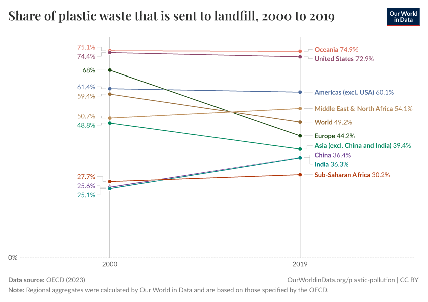 “Data Page: Share of plastic waste that is sent to landfill”, part of the following publication: Hannah Ritchie, Veronika Samborska, and Max Roser (2023) - “Plastic Pollution”. Data adapted from OECD. Retrieved from https://refactor-responseset-ergonom.owid.pages.dev:8789/20250909-093708/grapher/plastic-waste-landfill.html [online resource] (archived on September 9, 2025).How to cite this data