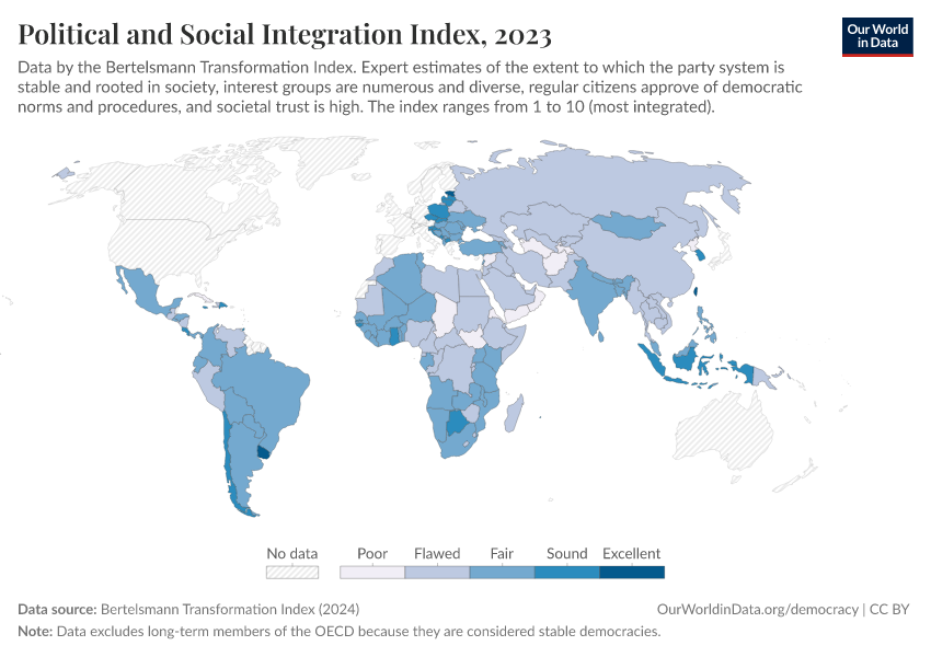 “Data Page: Political and Social Integration Index”, part of the following publication: Bastian Herre, Lucas Rodés-Guirao, and Esteban Ortiz-Ospina (2013) - “Democracy”. Data adapted from Bertelsmann Transformation Index. Retrieved from https://refactor-responseset-ergonom.owid.pages.dev:8789/20260105-133053/grapher/political-social-integration-index-bti.html [online resource] (archived on January 5, 2026).How to cite this data