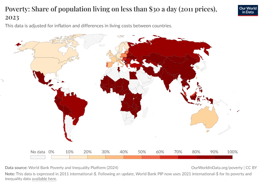 World Bank Poverty and Inequality Platform (2024) – with major processing by Our World in Data. “Poverty: Share of population living on less than $30 a day (2011 prices) – World Bank” [dataset]. World Bank Poverty and Inequality Platform, “World Bank Poverty and Inequality Platform (PIP) 20240627_2017, 20240627_2011” [original data]. Retrieved February 26, 2026 from https://refactor-responseset-ergonom.owid.pages.dev:8789/20251022-091218/grapher/poverty-share-on-less-than-30-per-day-2011-ppp.html (archived on October 22, 2025).