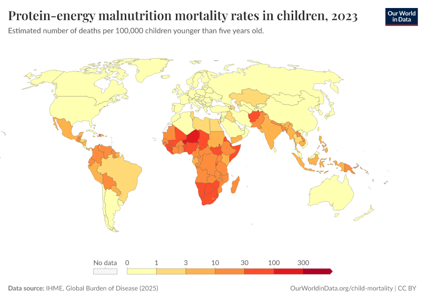 IHME, Global Burden of Disease (2025) – with major processing by Our World in Data. “Protein-energy malnutrition mortality rates in children ” [dataset]. IHME, Global Burden of Disease, “Global Burden of Disease - Deaths” [original data]. Retrieved February 26, 2026 from https://refactor-responseset-ergonom.owid.pages.dev:8789/20260211-174736/grapher/protein-energy-malnutrition-mortality-rates-in-children.html (archived on February 11, 2026).