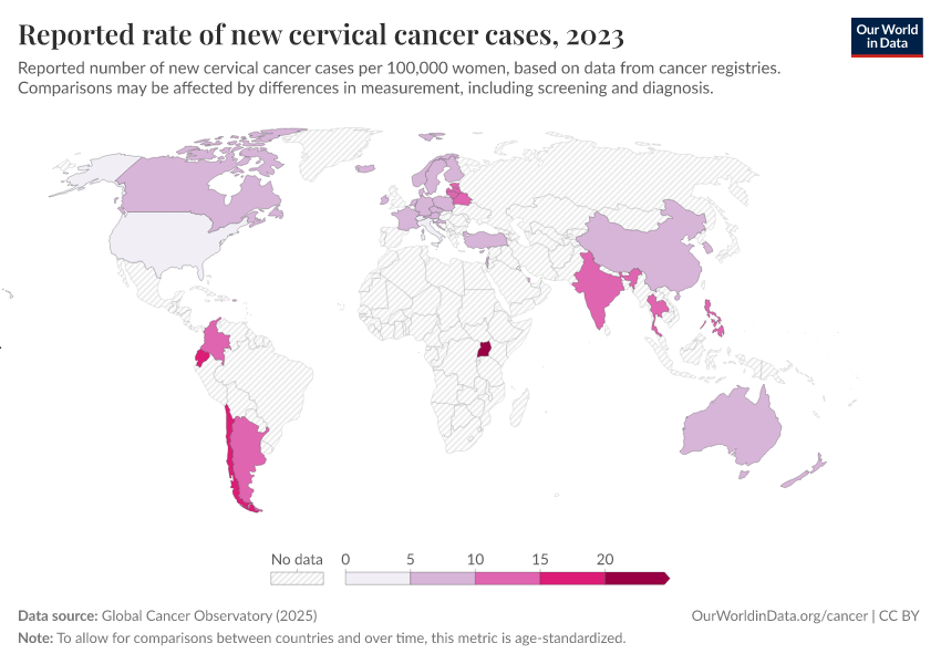 “Data Page: Reported rate of new cervical cancer cases”, part of the following publication: Saloni Dattani, Veronika Samborska, Hannah Ritchie, and Max Roser (2024) - “Cancer”. Data adapted from Global Cancer Observatory. Retrieved from https://refactor-responseset-ergonom.owid.pages.dev:8789/20250909-093708/grapher/reported-rate-of-new-cervical-cancer-cases.html [online resource] (archived on September 9, 2025).How to cite this data