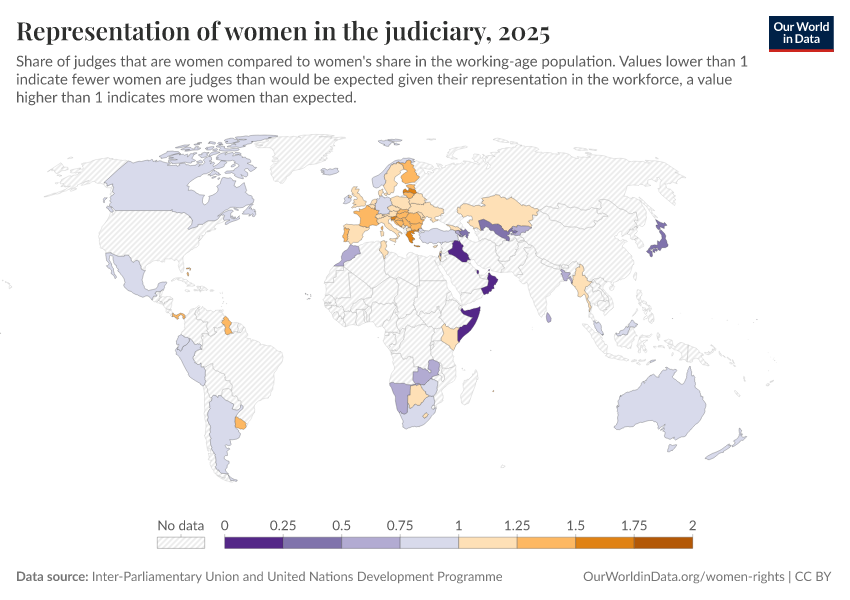“Data Page: Representation of women in the judiciary”. Our World in Data (2026). Data adapted from Inter-Parliamentary Union and United Nations Development Programme. Retrieved from https://refactor-responseset-ergonom.owid.pages.dev:8789/20260105-133053/grapher/representation-of-women-in-the-judiciary.html [online resource] (archived on January 5, 2026).How to cite this data