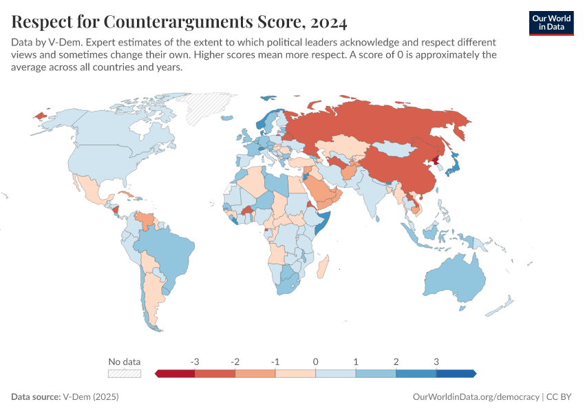 “Data Page: Respect for counterarguments”, part of the following publication: Bastian Herre, Lucas Rodés-Guirao, and Esteban Ortiz-Ospina (2013) - “Democracy”. Data adapted from V-Dem. Retrieved from https://refactor-responseset-ergonom.owid.pages.dev:8789/20260204-170225/grapher/respect-for-counterarguments-score.html [online resource] (archived on February 4, 2026).How to cite this data