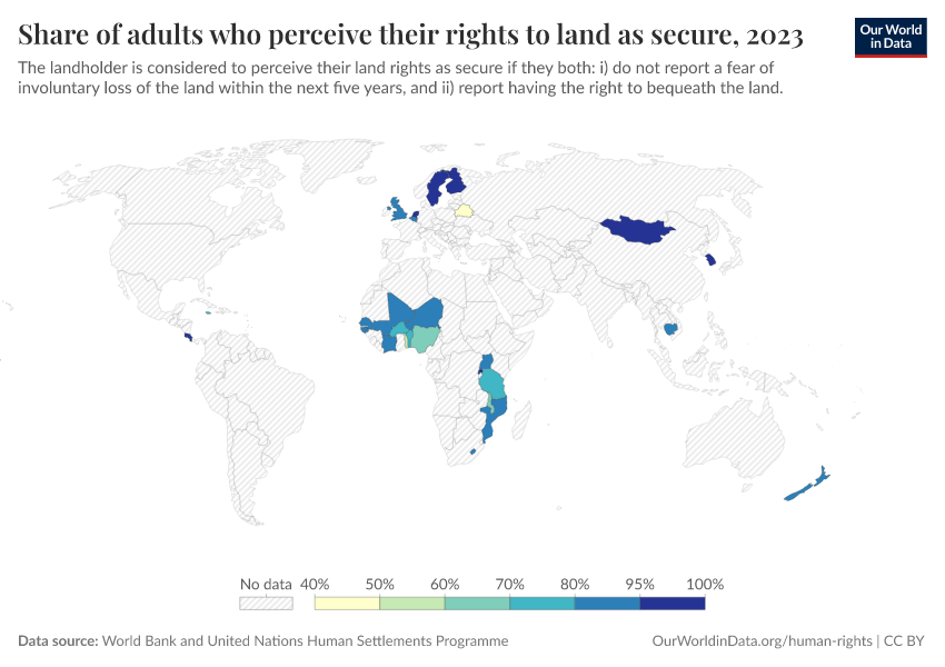 “Data Page: Share of adults who perceive their rights to land as secure”. Our World in Data (2026). Data adapted from World Bank and United Nations Human Settlements Programme. Retrieved from https://refactor-responseset-ergonom.owid.pages.dev:8789/20251121-151713/grapher/share-of-adults-who-perceive-their-rights-to-land-as-secure.html [online resource] (archived on November 21, 2025).How to cite this data