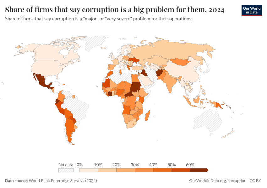 World Bank Enterprise Surveys (2024) – with minor processing by Our World in Data. “Share of firms that say corruption is a big problem for them” [dataset]. World Bank Enterprise Surveys, “Enterprise Surveys - Corruption” [original data]. Retrieved February 26, 2026 from https://refactor-responseset-ergonom.owid.pages.dev:8789/20251209-133038/grapher/share-of-firms-that-say-corruption-is-a-big-problem-for-them.html (archived on December 9, 2025).