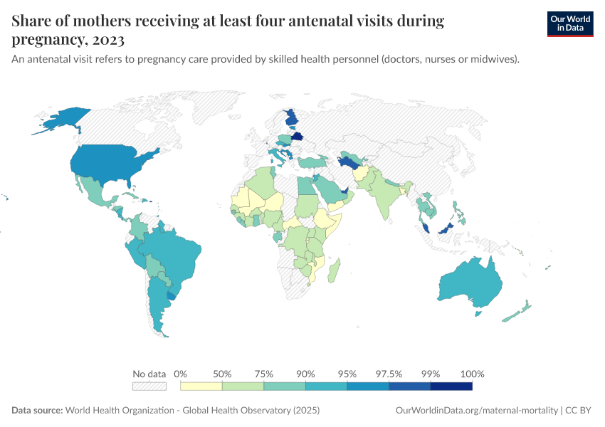 World Health Organization - Global Health Observatory (2025) – processed by Our World in Data. “Share of mothers receiving at least four antenatal visits during pregnancy” [dataset]. World Health Organization, “Global Health Observatory” [original data]. Retrieved February 26, 2026 from https://refactor-responseset-ergonom.owid.pages.dev:8789/20250909-093708/grapher/share-of-mothers-receiving-at-least-four-antenatal-visits-during-pregnancy.html (archived on September 9, 2025).