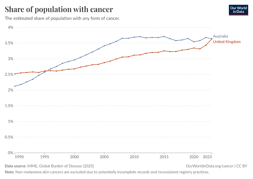 “Data Page: Share of population with cancer”, part of the following publication: Esteban Ortiz-Ospina and Max Roser (2016) - “Global Health”. Data adapted from IHME, Global Burden of Disease. Retrieved from https://refactor-responseset-ergonom.owid.pages.dev:8789/20260212-172859/grapher/share-of-population-with-cancer-crude.html [online resource] (archived on February 12, 2026).How to cite this data