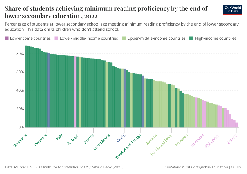 “Data Page: Share of students achieving minimum reading proficiency by the end of lower secondary education”, part of the following publication: Hannah Ritchie, Veronika Samborska, Esteban Ortiz-Ospina, and Max Roser (2023) - “Global Education”. Data adapted from UNESCO Institute for Statistics. Retrieved from https://refactor-responseset-ergonom.owid.pages.dev:8789/20260122-091445/grapher/share-of-students-at-end-of-lower-secondary-education-with-minimum-reading-proficiency.html [online resource] (archived on January 22, 2026).How to cite this data