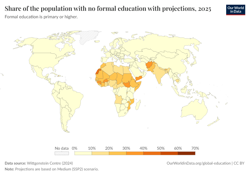 “Data Page: Share of the population with no formal education with projections”, part of the following publication: Hannah Ritchie, Veronika Samborska, Esteban Ortiz-Ospina, and Max Roser (2023) - “Global Education”. Data adapted from Wittgenstein Centre. Retrieved from https://refactor-responseset-ergonom.owid.pages.dev:8789/20260212-032504/grapher/share-of-the-population-with-no-formal-education-with-projections.html [online resource] (archived on February 12, 2026).How to cite this data