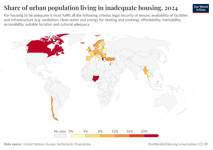 “Data Page: Share of urban population living in inadequate housing”. Our World in Data (2026). Data adapted from United Nations Human Settlements Programme. Retrieved from https://refactor-responseset-ergonom.owid.pages.dev:8789/20251120-211749/grapher/share-of-urban-population-living-in-inadequate-housing.html [online resource] (archived on November 20, 2025).How to cite this data