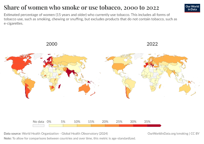 “Data Page: Share of women who smoke or use tobacco”, part of the following publication: Hannah Ritchie and Max Roser (2023) - “Smoking”. Data adapted from World Health Organization. Retrieved from https://refactor-responseset-ergonom.owid.pages.dev:8789/20260119-065148/grapher/share-of-women-who-are-smoking.html [online resource] (archived on January 19, 2026).How to cite this data