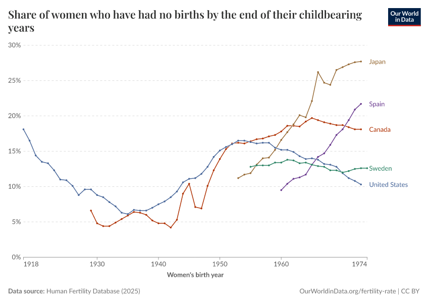 “Data Page: Share of women who have had no births by the end of their childbearing years”, part of the following publication: Saloni Dattani, Lucas Rodés-Guirao, and Max Roser (2025) - “Fertility Rate”. Data adapted from Human Fertility Database. Retrieved from https://refactor-responseset-ergonom.owid.pages.dev:8789/20251022-230420/grapher/share-of-women-who-have-had-no-births-across-their-childbearing-years.html [online resource] (archived on October 22, 2025).How to cite this data