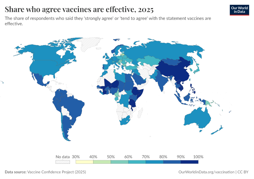Vaccine Confidence Project (2025) – processed by Our World in Data. “Share who agree vaccines are effective” [dataset]. Vaccine Confidence Project, “Vaccine Confidence Index” [original data]. Retrieved February 26, 2026 from https://refactor-responseset-ergonom.owid.pages.dev:8789/20250909-093708/grapher/share-who-agree-vaccines-are-effective.html (archived on September 9, 2025).