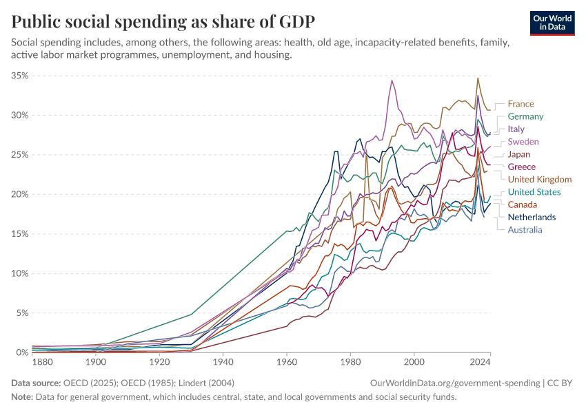 OECD (2025); OECD (1985); Lindert (2004) – with major processing by Our World in Data. “Public social expenditure as a share of GDP – Lindert, OECD – Historical data” [dataset]. OECD, “OECD Social Expenditure Database (SOCX)”; OECD, “Social Expenditure 1960-1990: Problems of Growth and Control”; Lindert, “Growing Public: Social Spending and Economic Growth since the Eighteenth Century” [original data]. Retrieved February 26, 2026 from https://refactor-responseset-ergonom.owid.pages.dev:8789/20251211-184053/grapher/social-spending-oecd-longrun.html (archived on December 11, 2025).