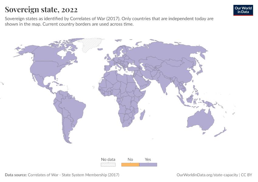 “Data Page: Sovereign state”, part of the following publication: Bastian Herre and Pablo Arriagada (2023) - “State Capacity”. Data adapted from Correlates of War. Retrieved from https://refactor-responseset-ergonom.owid.pages.dev:8789/20260224-080822/grapher/sovereign-state-cow.html [online resource] (archived on February 24, 2026).How to cite this data