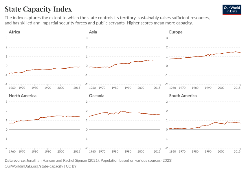 “Data Page: State Capacity Index”, part of the following publication: Bastian Herre and Pablo Arriagada (2023) - “State Capacity”. Data adapted from Jonathan Hanson and Rachel Sigman, Various sources. Retrieved from https://refactor-responseset-ergonom.owid.pages.dev:8789/20260223-071105/grapher/state-capacity-index.html [online resource] (archived on February 23, 2026).How to cite this data