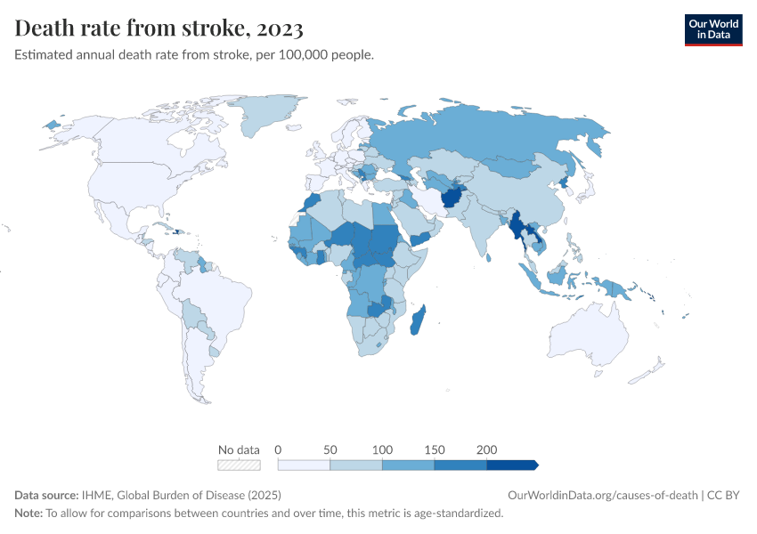 IHME, Global Burden of Disease (2025) – with major processing by Our World in Data. “Death rate from stroke” [dataset]. IHME, Global Burden of Disease, “Global Burden of Disease - Deaths” [original data]. Retrieved February 26, 2026 from https://refactor-responseset-ergonom.owid.pages.dev:8789/20260211-173942/grapher/stroke-death-rates.html (archived on February 11, 2026).