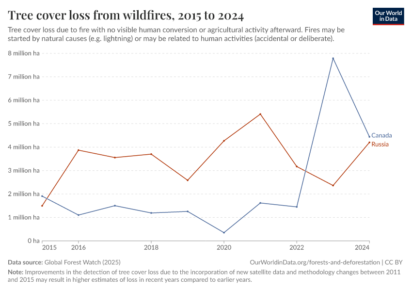 Global Forest Watch (2025) – with major processing by Our World in Data. “Tree cover loss from wildfires” [dataset]. Global Forest Watch, “Tree Cover Loss by Dominant Driver” [original data]. Retrieved February 26, 2026 from https://refactor-responseset-ergonom.owid.pages.dev:8789/20260119-065148/grapher/tree-cover-loss-from-wildfires.html (archived on January 19, 2026).